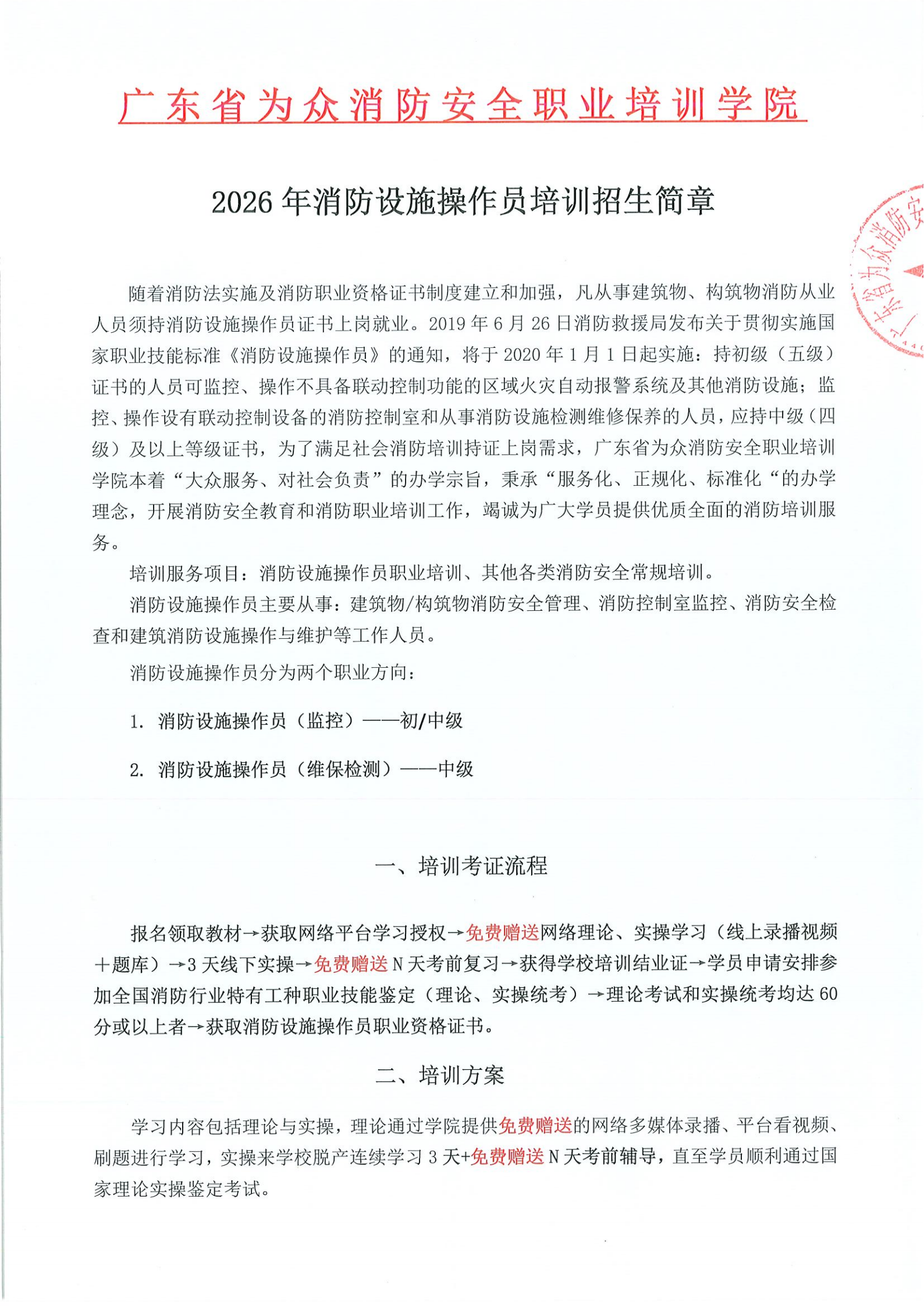 • 2026年广东为众消防培训学院消防设施操作员招生简章